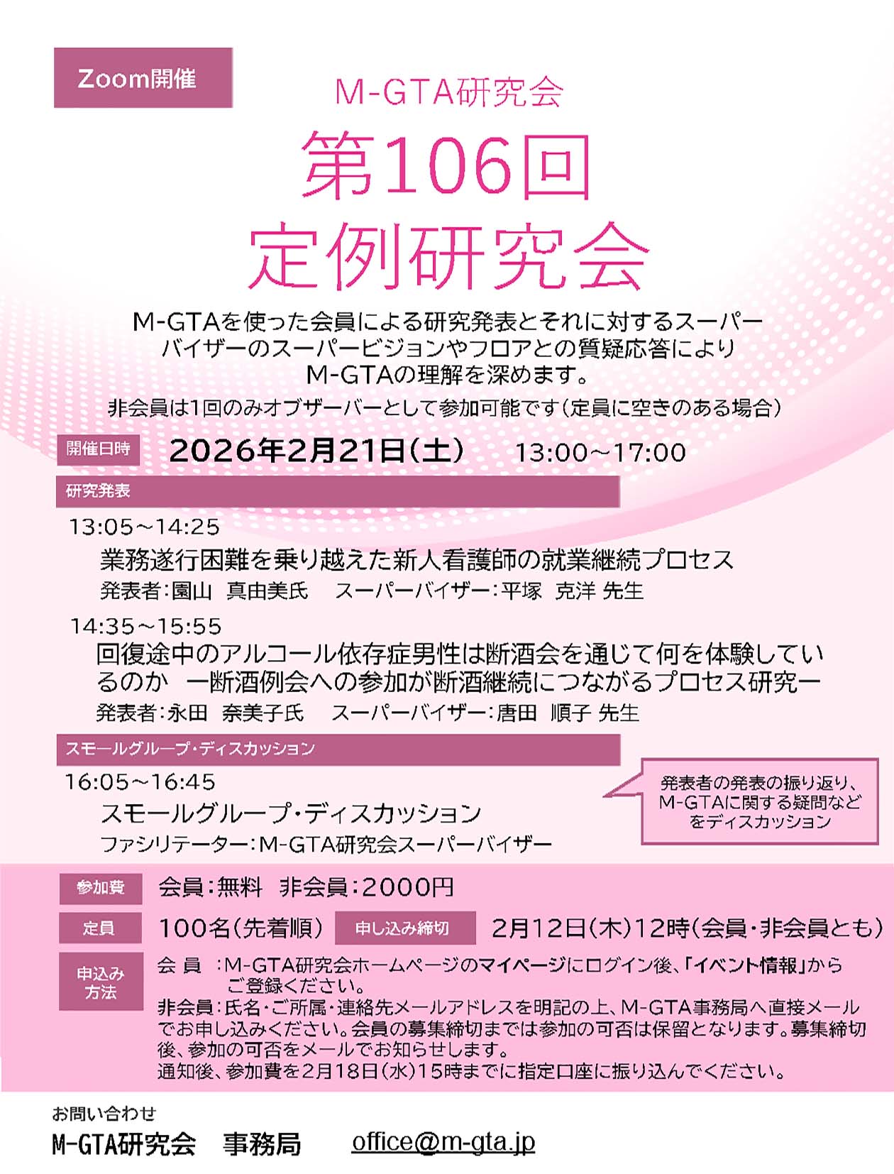 1)非会員の方も定員に空きのある場合、参加費2000円を事前に振り込んでいただいたうえで1回に限り参加できます。2)氏名・ご所属先・連絡先メールアドレスを明記の上、M-GTA研究会事務局(office@m-gta.jp)へメールでお申し込みください。